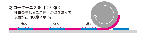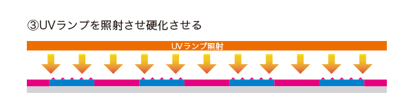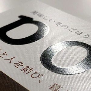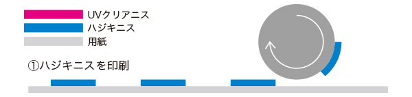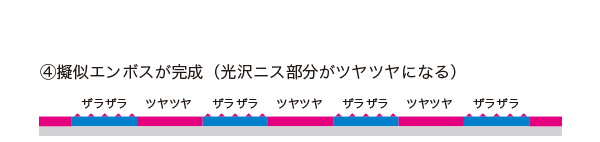 2種類のニスがはじき合う特性とUVによる瞬間硬化を利用した凸凹を表現する特種印刷です。高度な印刷技術を要しますが印刷での一工程(ワンパス)での加工が完了しますので、今までのエンボス加工に比べて大幅なコストダウンが可能となりました。