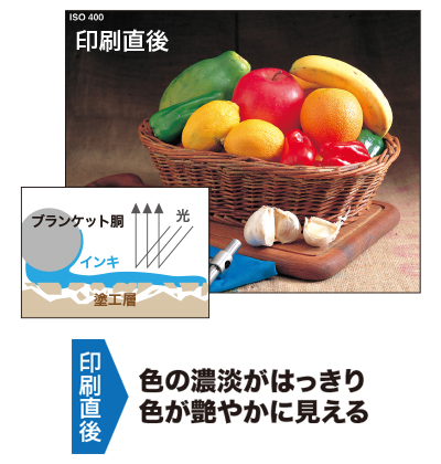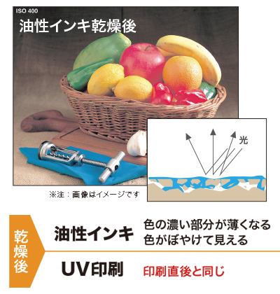 《印刷用語》ドライダウンとは・・・一般的な油性印刷では、インキは用紙に浸透しながら乾燥するのため、紙の表面の微妙な凹凸にインキが浸透することでインキの厚みが減り、印刷直後と印刷の乾燥後では濃度が変化(ドライダウン)します。UV印刷は瞬間硬化するため、ドライダウンを起こさず、裏付き、汚れといった従来の印刷で起こるトラブルの発生も低減することができるため、より高品質な印刷物をお客様にご提供することができます。